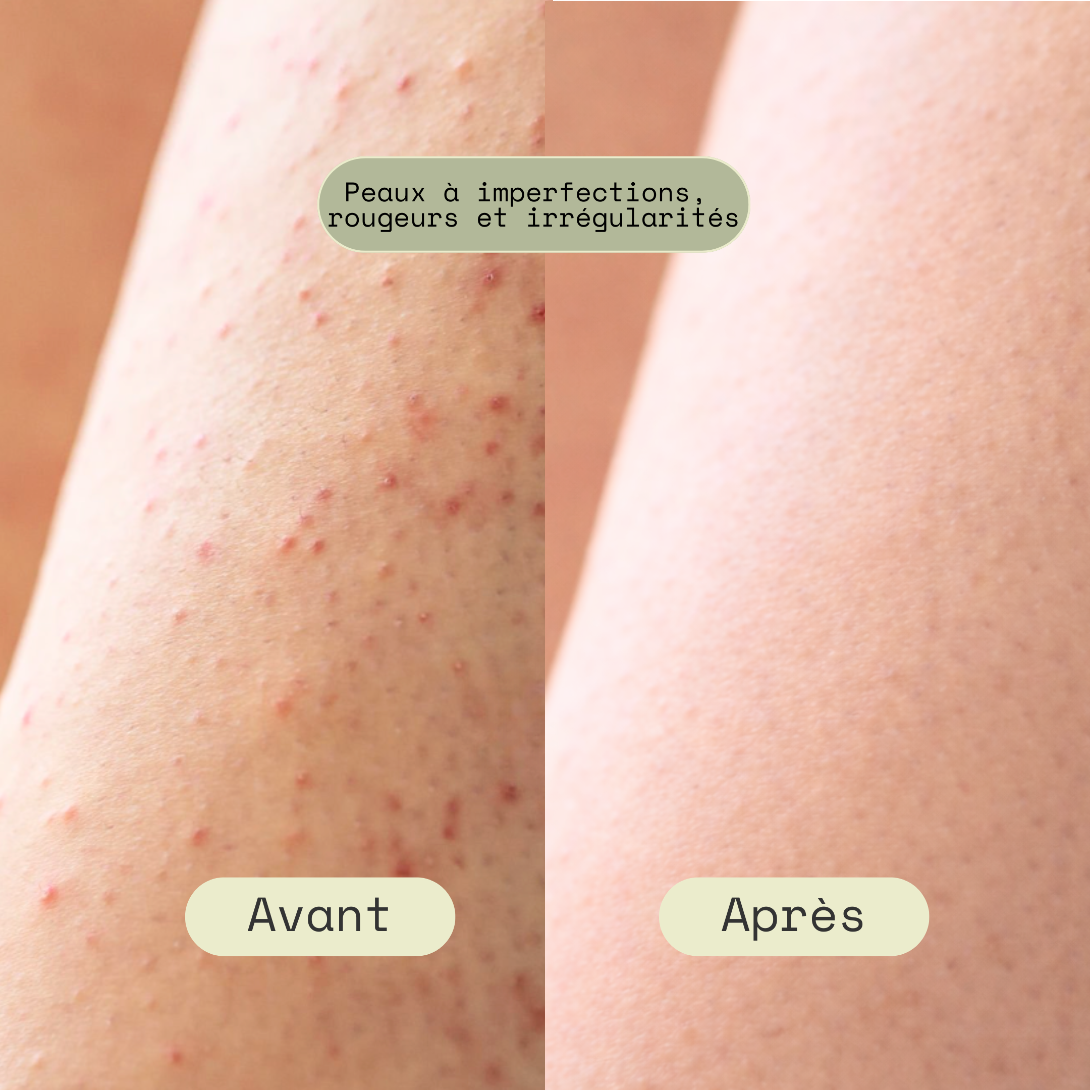 Avant, la peau est irrégulière, encombrée de cellules mortes et d’impuretés. Les pores paraissent plus visibles, les poils ont tendance à s’incarner et de petites imperfections peuvent apparaître, notamment sur les zones sensibles.